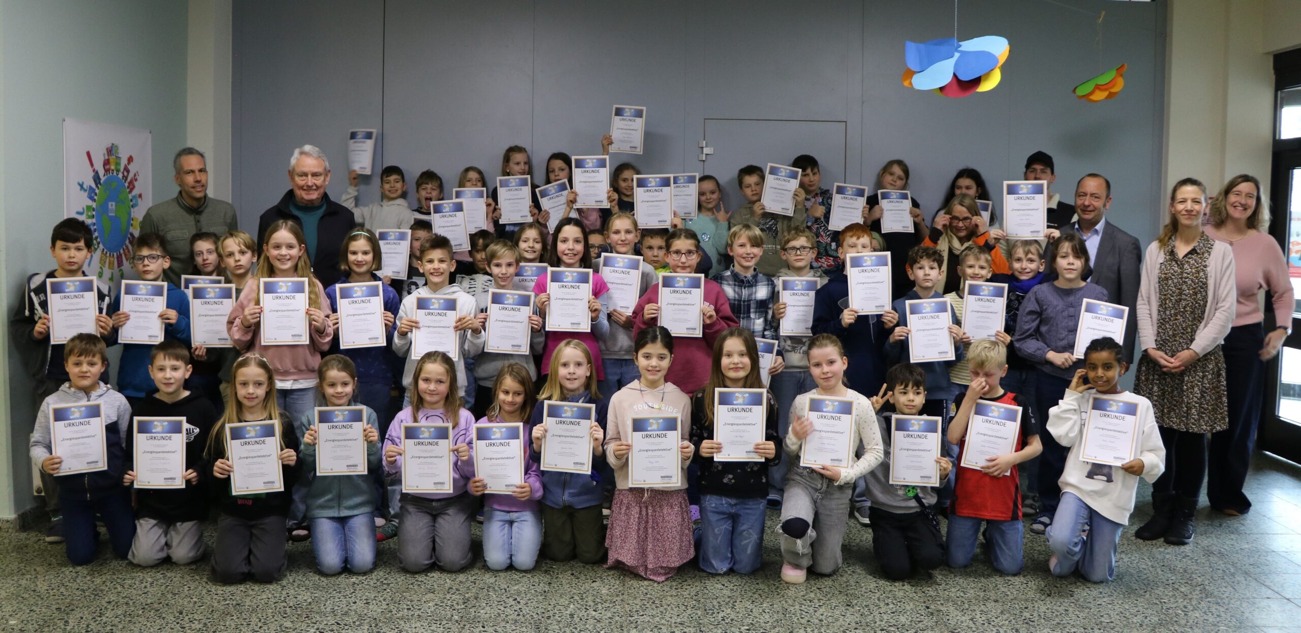 Im Anschluss an die Urkundenverleihung erhielten die frischgebackenen Energiespardetektive gleich ihr erstes Job-Angebot. „Falls ihr nach der Schule eine Stelle sucht, meldet euch gerne bei der Energieagentur“, wandte sich Thorsten Schmidt mit einem Zwinkern an die Kinder. „Wir sind ja nun quasi Kollegen. Auch die Energieagentur verteilt Tipps und berät Menschen, wie sie Energie sparen können.“
